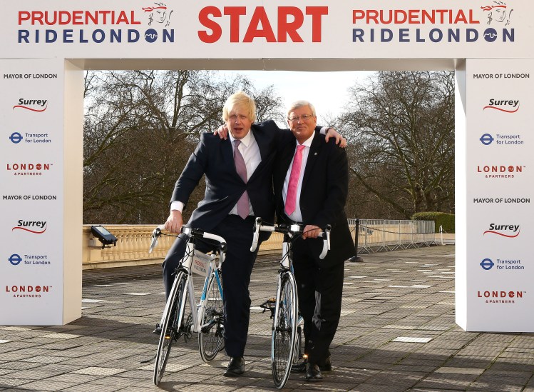 LONDON, ENGLAND – FEBRUARY 7: Mayor of London Boris Johnson and Surrey County Council Leader David Hodge pose during the Prudential RideLondon Announcement at Prince Phillip House on February 7, 2013 in London, England. (Photo by Jan Kruger/Getty Images)