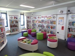 With a fresh and attractive colour scheme throughout, the library also offers study spaces and comfortable seating areas with newspapers.