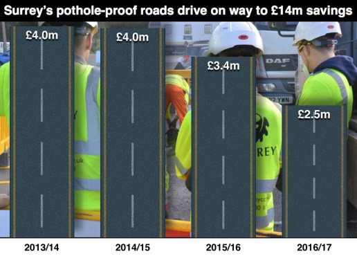 A drive to make Surrey’s roads more pothole-proof is also on course to save local taxpayers nearly £14 million – enough to overhaul almost 30 miles for free.