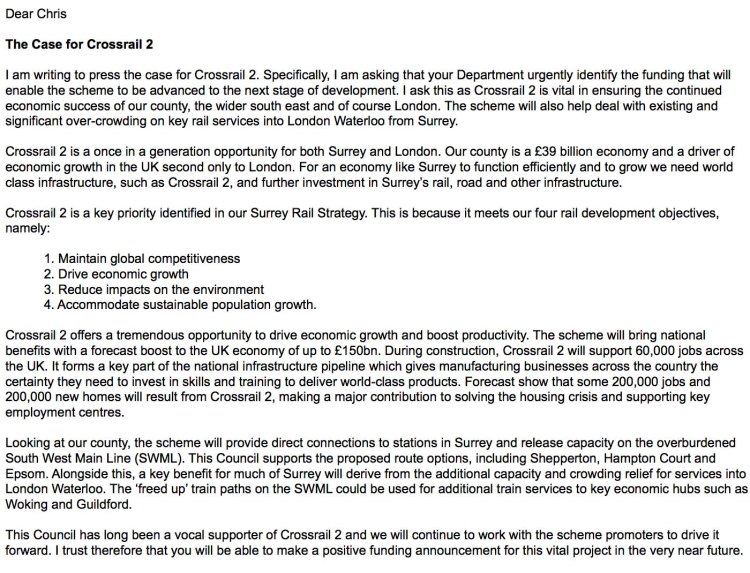 In a letter to the Transport Secretary, David Hodge describes Crossrail 2, which is set to serve Shepperton, Hampton Court and Epsom in Surrey, as a “once in a generation opportunity” to drive economic growth.