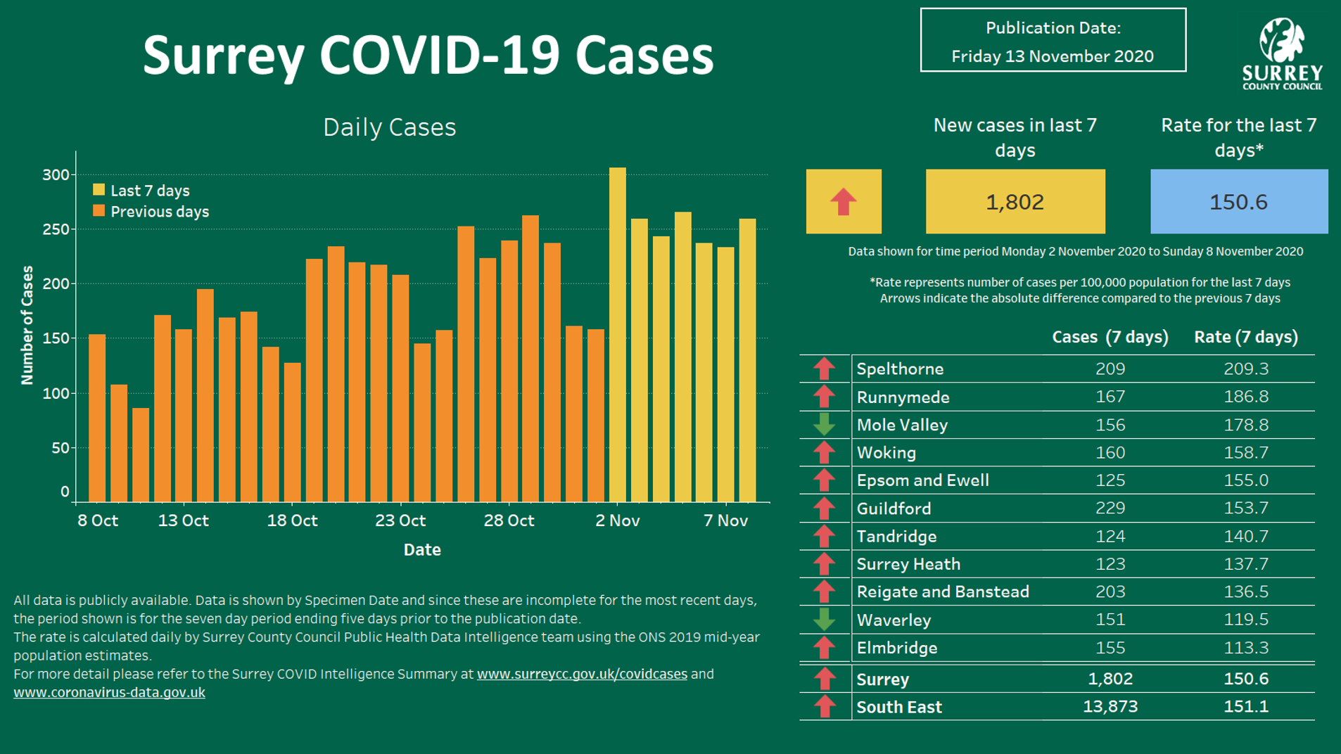 Surrey County Council has issued its latest data dashboard highlighting the latest figures for cases of COVID-19 in the county.