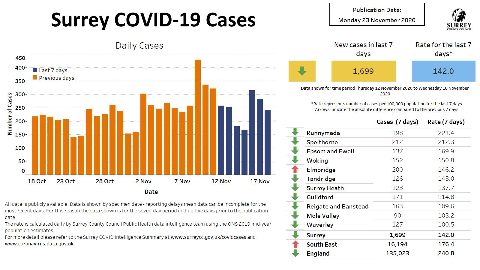 Surrey County Council has issued its latest data dashboard highlighting the latest figures for cases of COVID-19 in the county.