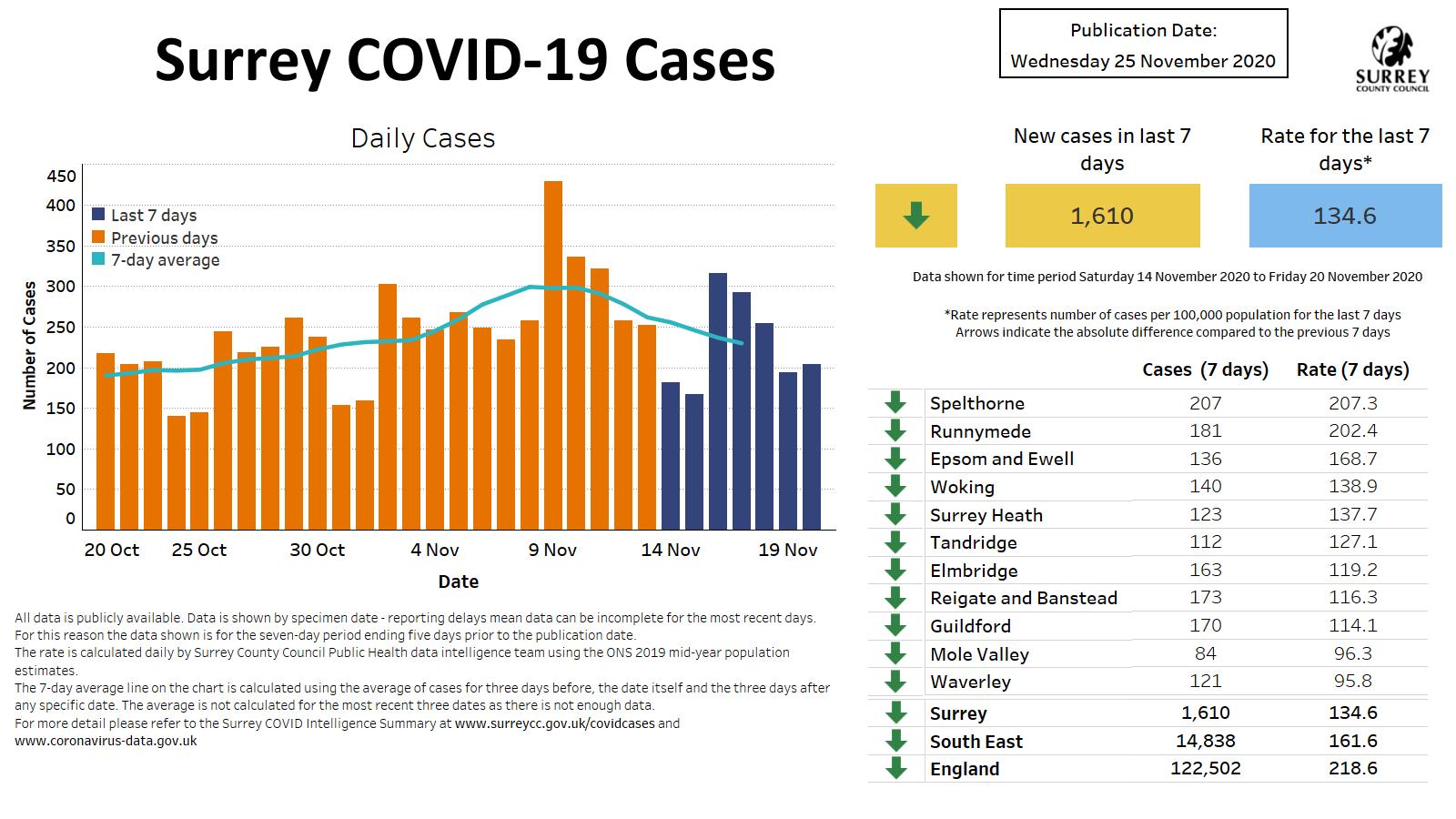 Surrey County Council has issued its latest data dashboard highlighting the latest figures for cases of COVID-19 in the county.