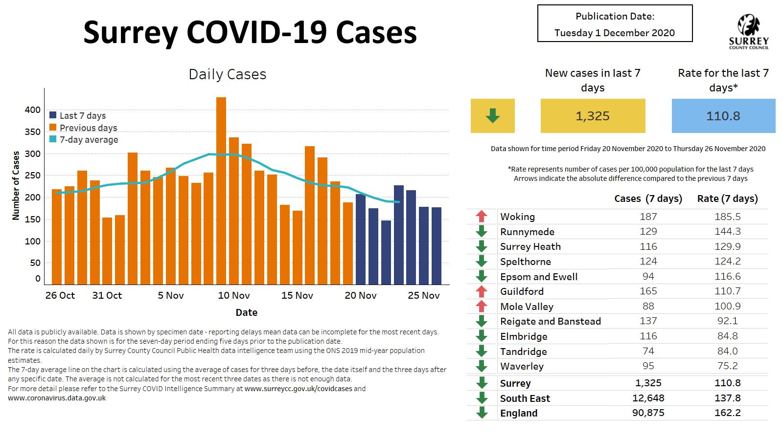 An update on Surrey’s latest local COVID alert level: https://news.surreycc.gov.uk/2020/11/26/an-update-on-the-alert-level-in-surrey/
