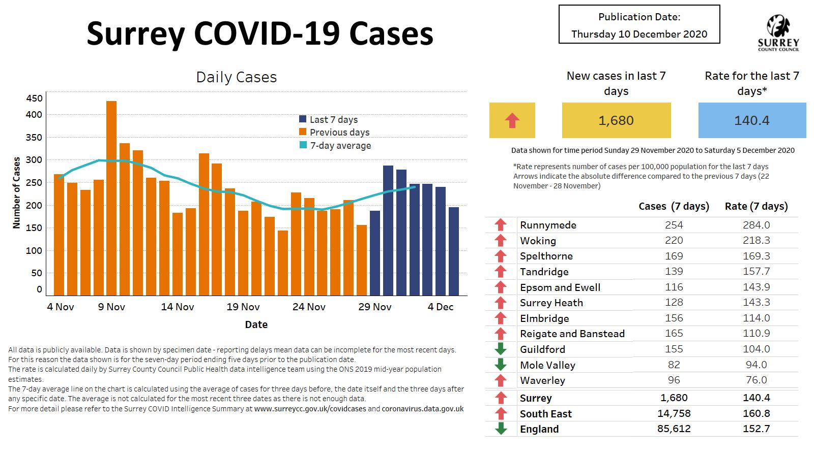 Surrey County Council has issued its latest data dashboard highlighting the latest figures for cases of COVID-19 in the county.