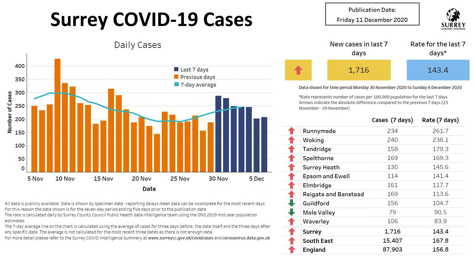 Surrey County Council has issued its latest data dashboard highlighting the latest figures for cases of COVID-19 in the county.