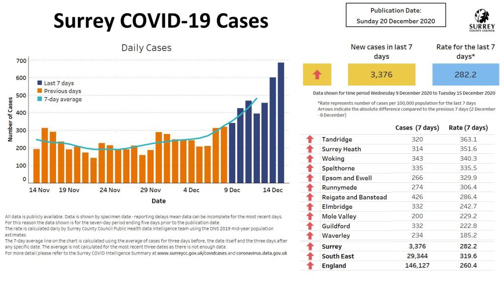 Surrey County Council has issued its latest data dashboard highlighting the latest figures for cases of COVID-19 in the county.