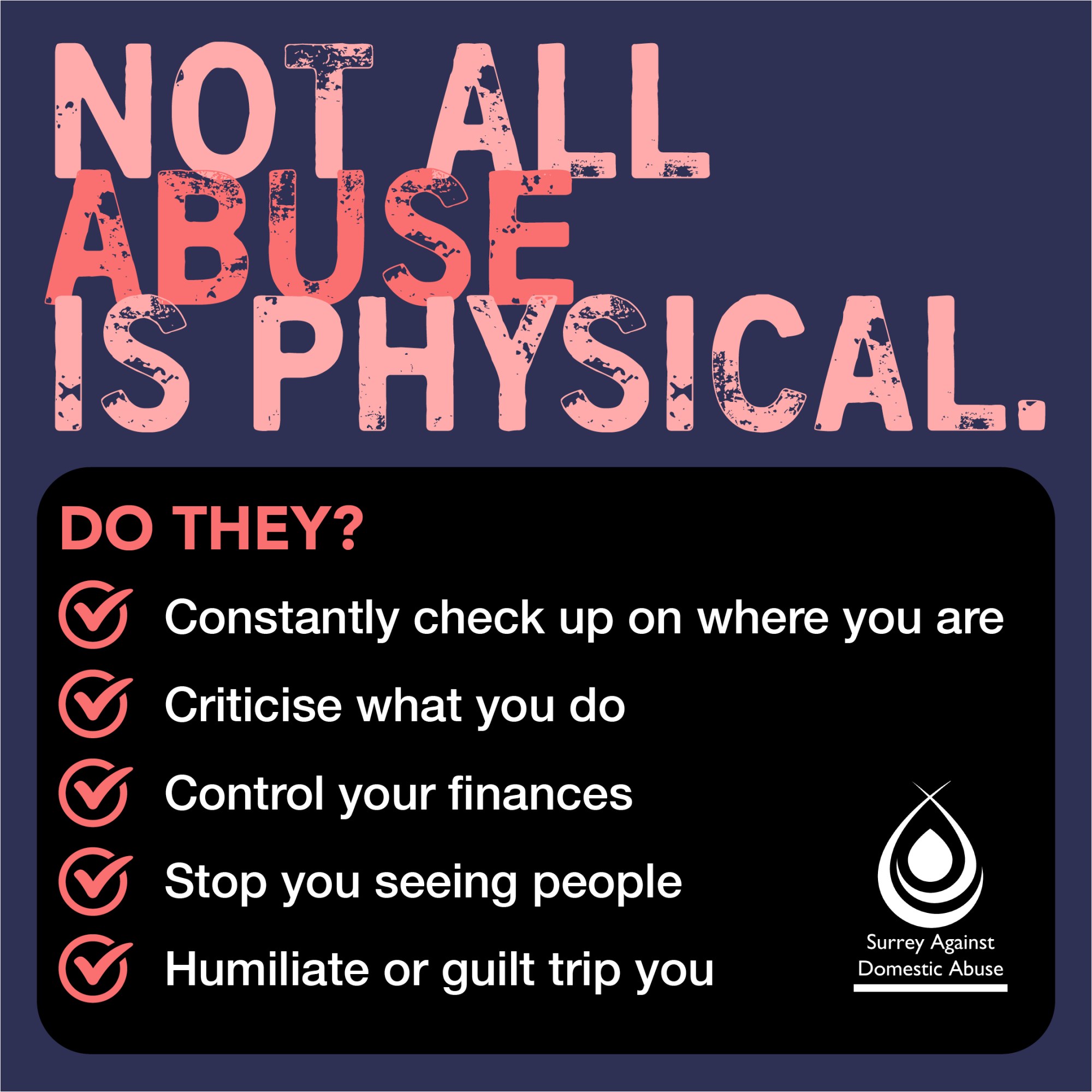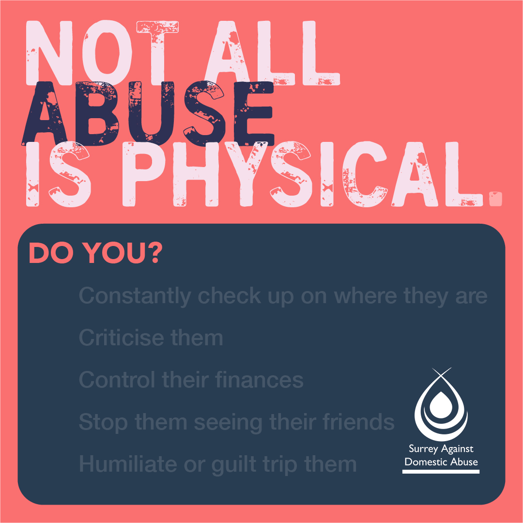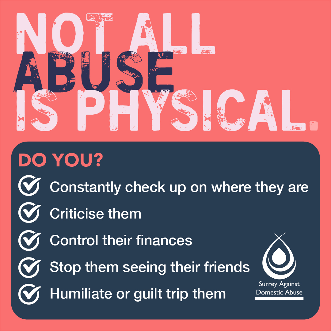 This joint campaign ‘Not all abuse is physical’, which consists of two simple checklists, will run throughout Surrey Domestic Abuse Awareness Week. It aims to support survivors of abusive relationships, including young adults, to recognise the signs in others and it also seeks to help abusers recognise this behaviour in themselves.