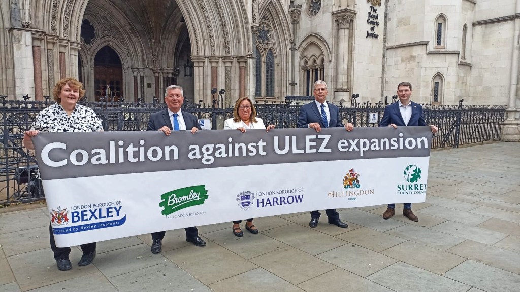 Representatives from the five councils – Bexley, Bromley, Harrow, Hillingdon and Surrey – met on the steps of the High Court in central London on Tuesday 4 July, ahead of the opening day of the Judicial Review the coalition has brought against TfL and the Mayor of London, over planned expansion of the ULEZ to outer London.