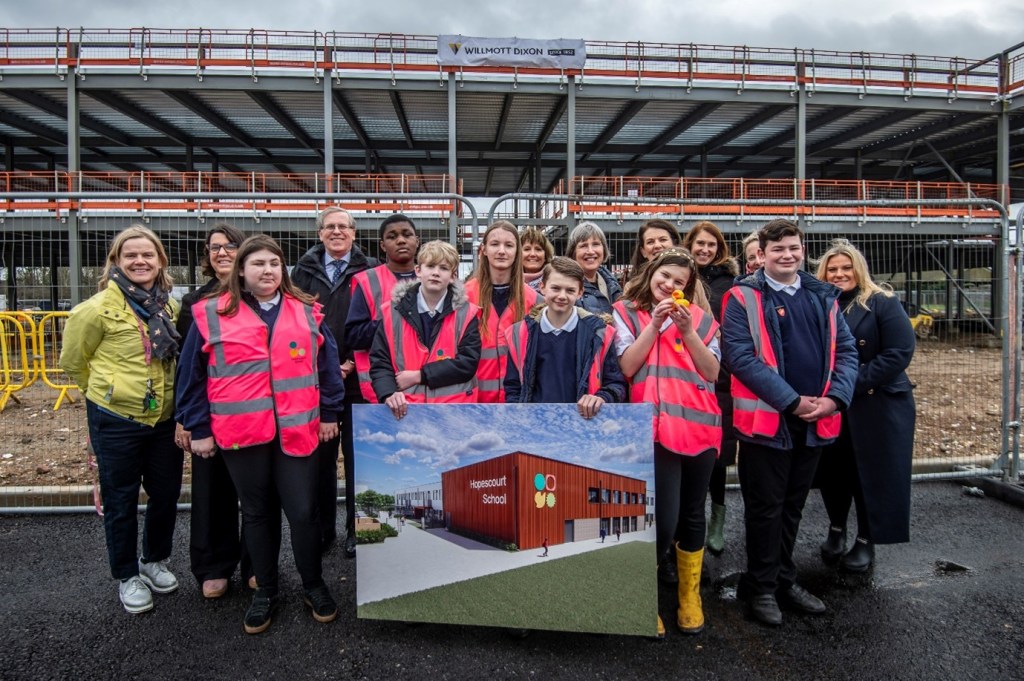 Pupils and staff from Hopescourt School, along with Surrey County Council, Bourne Education Trust, AtkinsRéalis, and Willmott Dixon celebrated a major milestone in the new school building’s construction.